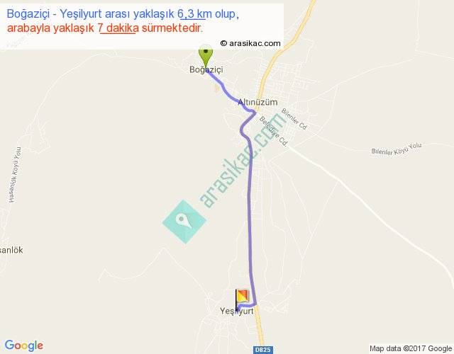 Boğaziçi - Yeşilyurt arası yaklaşık olarak 90 km/h ile yukarıda belirtilen sürede olup, iki yerin kuş uçuşu uzaklığı (mesafesi) 5'dir. Yolculuk otobüsle 9 dakika sürmektedir.