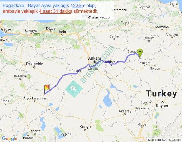 Boğazkale - Bayat arası yaklaşık olarak 90 km/h ile yukarıda belirtilen sürede olup, iki yerin kuş uçuşu uzaklığı (mesafesi) 335'dir. Eğer belirtilen yerler arasında uçak seferi var ise bu süre uçakla 30 dakika'ya kadar düşebilir. Yolculuk otobüsle 5 saat 52 dakika sürmektedir.