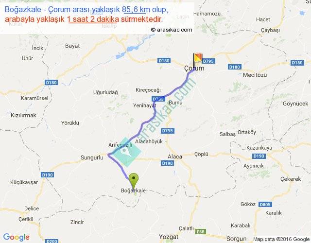 Boğazkale - Çorum arası yaklaşık olarak 90 km/h ile yukarıda belirtilen sürede olup, iki yerin kuş uçuşu uzaklığı (mesafesi) 65'dir. Yolculuk otobüsle 1 saat 20 dakika sürmektedir.