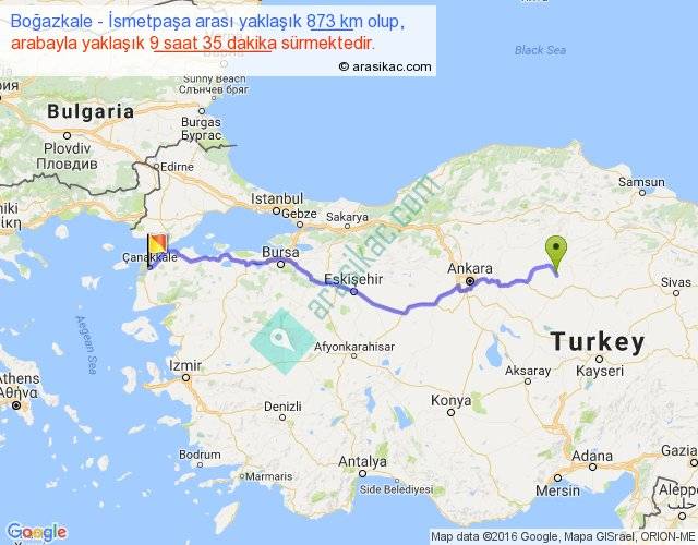 Boğazkale - İsmetpaşa arası yaklaşık olarak 90 km/h ile yukarıda belirtilen sürede olup, iki yerin kuş uçuşu uzaklığı (mesafesi) 693'dir. Eğer belirtilen yerler arasında uçak seferi var ise bu süre uçakla 1 saat 03 dakika'ya kadar düşebilir. Yolculuk otobüsle 12 saat 27 dakika sürmektedir.