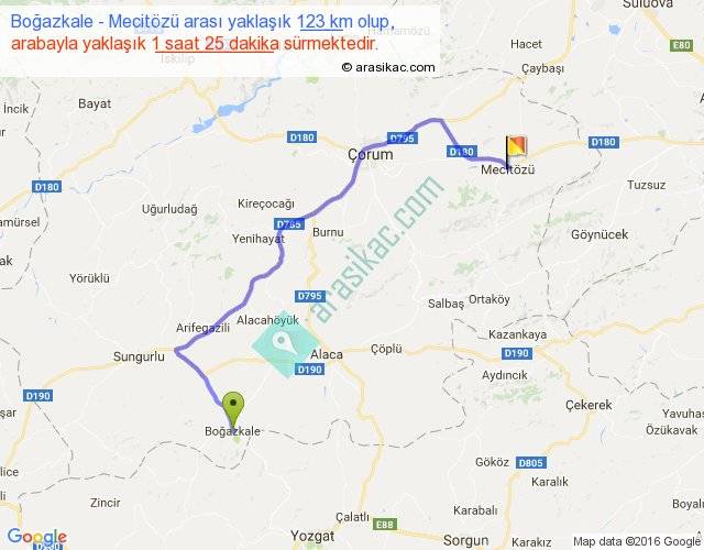 Boğazkale - Mecitözü arası yaklaşık olarak 90 km/h ile yukarıda belirtilen sürede olup, iki yerin kuş uçuşu uzaklığı (mesafesi) 80'dir. Yolculuk otobüsle 1 saat 50 dakika sürmektedir.