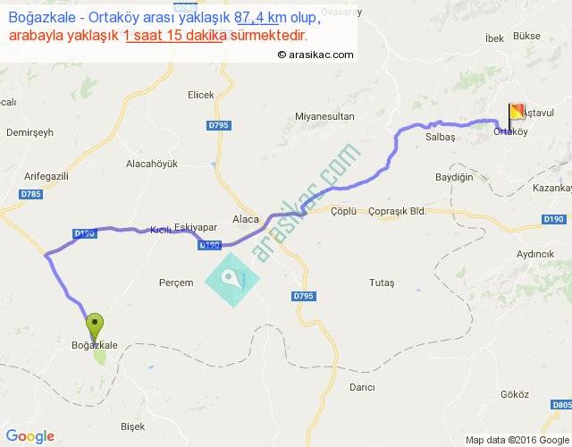 Boğazkale - Ortaköy arası yaklaşık olarak 90 km/h ile yukarıda belirtilen sürede olup, iki yerin kuş uçuşu uzaklığı (mesafesi) 150'dir. Yolculuk otobüsle 3 saat 25 dakika sürmektedir.