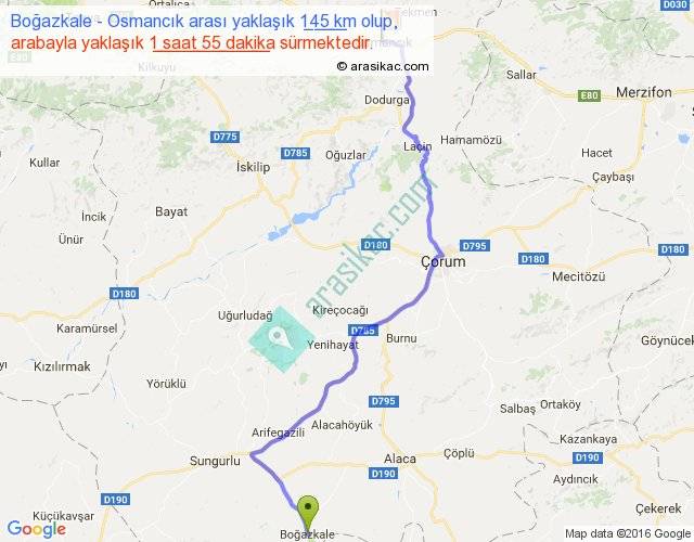 Boğazkale - Osmancık arası yaklaşık olarak 90 km/h ile yukarıda belirtilen sürede olup, iki yerin kuş uçuşu uzaklığı (mesafesi) 106'dir. Yolculuk otobüsle 2 saat 29 dakika sürmektedir.