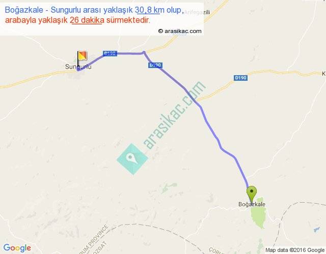 Boğazkale - Sungurlu arası yaklaşık olarak 90 km/h ile yukarıda belirtilen sürede olup, iki yerin kuş uçuşu uzaklığı (mesafesi) 25'dir. Yolculuk otobüsle 33 dakika sürmektedir.