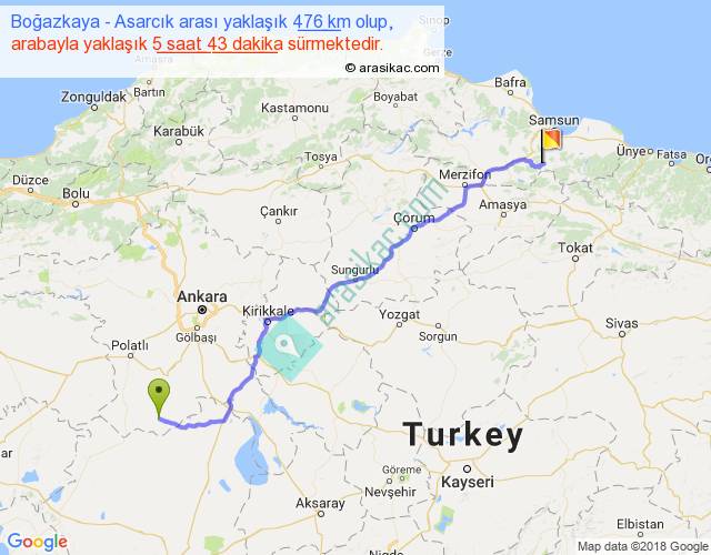 Boğazkaya - Asarcık arası yaklaşık olarak 90 km/h ile yukarıda belirtilen sürede olup, iki yerin kuş uçuşu uzaklığı (mesafesi) 386'dir. Eğer belirtilen yerler arasında uçak seferi var ise bu süre uçakla 35 dakika'ya kadar düşebilir. Yolculuk otobüsle 7 saat 25 dakika sürmektedir.