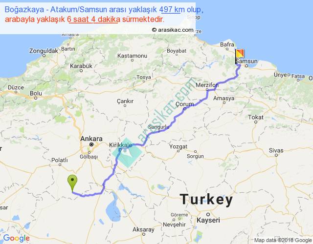 Boğazkaya - Atakum Samsun arası yaklaşık olarak 90 km/h ile yukarıda belirtilen sürede olup, iki yerin kuş uçuşu uzaklığı (mesafesi) 395'dir. Eğer belirtilen yerler arasında uçak seferi var ise bu süre uçakla 36 dakika'ya kadar düşebilir. Yolculuk otobüsle 7 saat 53 dakika sürmektedir.