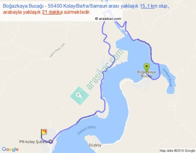 Boğazkaya Bucağı - 55400 Kolay Bafra Samsun arası yaklaşık olarak 90 km/h ile yukarıda belirtilen sürede olup, iki yerin kuş uçuşu uzaklığı (mesafesi) 6'dir. Yolculuk otobüsle 27 dakika sürmektedir.