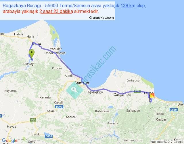 Boğazkaya Bucağı - 55600 Terme Samsun arası yaklaşık olarak 90 km/h ile yukarıda belirtilen sürede olup, iki yerin kuş uçuşu uzaklığı (mesafesi) 100'dir. Yolculuk otobüsle 3 saat 5 dakika sürmektedir.
