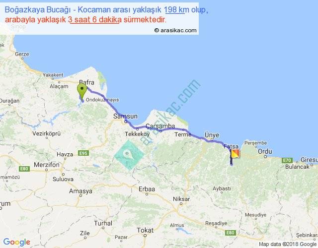 Boğazkaya Bucağı - Kocaman arası yaklaşık olarak 90 km/h ile yukarıda belirtilen sürede olup, iki yerin kuş uçuşu uzaklığı (mesafesi) 149'dir. Yolculuk otobüsle 4 saat 1 dakika sürmektedir.