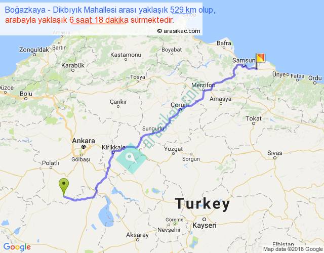 Boğazkaya - Dikbıyık Mahallesi arası yaklaşık olarak 90 km/h ile yukarıda belirtilen sürede olup, iki yerin kuş uçuşu uzaklığı (mesafesi) 423'dir. Eğer belirtilen yerler arasında uçak seferi var ise bu süre uçakla 39 dakika'ya kadar düşebilir. Yolculuk otobüsle 8 saat 11 dakika sürmektedir.