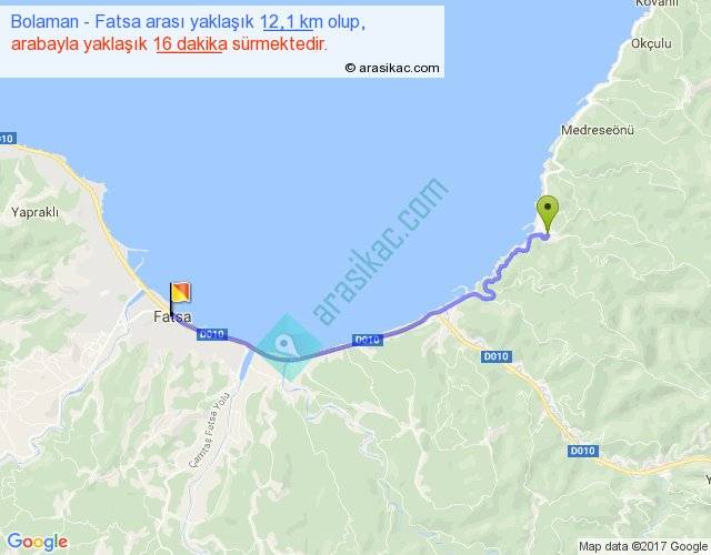 Bolaman - Fatsa arası yaklaşık olarak 90 km/h ile yukarıda belirtilen sürede olup, iki yerin kuş uçuşu uzaklığı (mesafesi) 10'dir. Yolculuk otobüsle 20 dakika sürmektedir.