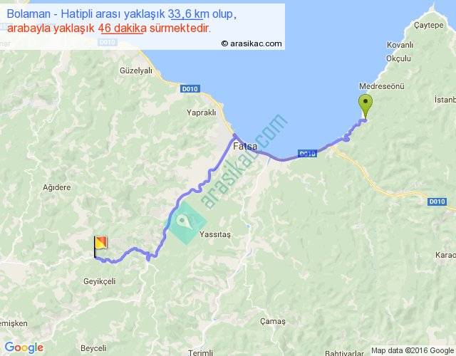 Bolaman - Hatipli arası yaklaşık olarak 90 km/h ile yukarıda belirtilen sürede olup, iki yerin kuş uçuşu uzaklığı (mesafesi) 24'dir. Yolculuk otobüsle 59 dakika sürmektedir.