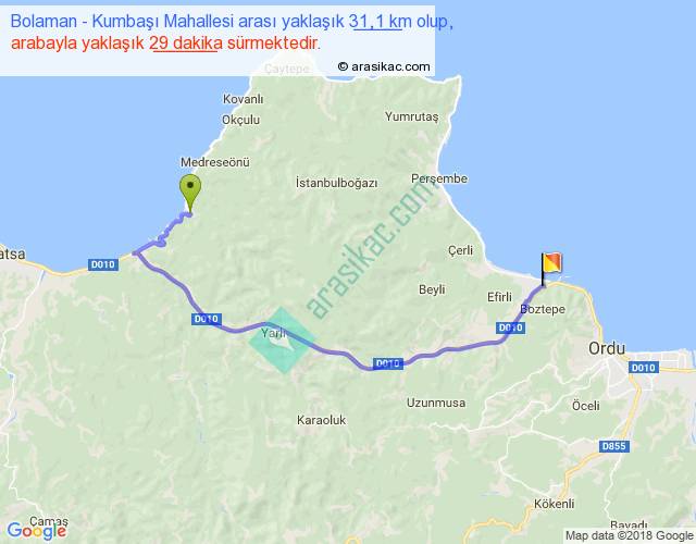 Bolaman - Kumbaşı Mahallesi arası yaklaşık olarak 90 km/h ile yukarıda belirtilen sürede olup, iki yerin kuş uçuşu uzaklığı (mesafesi) 19'dir. Yolculuk otobüsle 37 dakika sürmektedir.