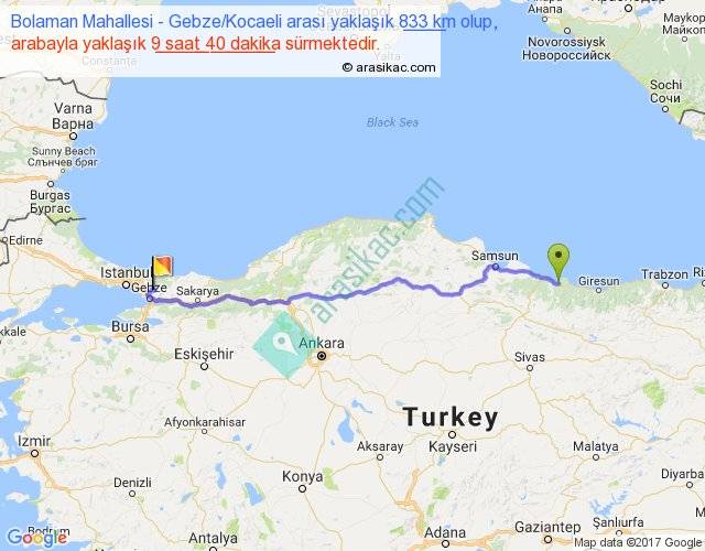 Bolaman Mahallesi - Gebze Kocaeli arası yaklaşık olarak 90 km/h ile yukarıda belirtilen sürede olup, iki yerin kuş uçuşu uzaklığı (mesafesi) 672'dir. Eğer belirtilen yerler arasında uçak seferi var ise bu süre uçakla 1 saat 02 dakika'ya kadar düşebilir. Yolculuk otobüsle 12 saat 34 dakika sürmektedir.