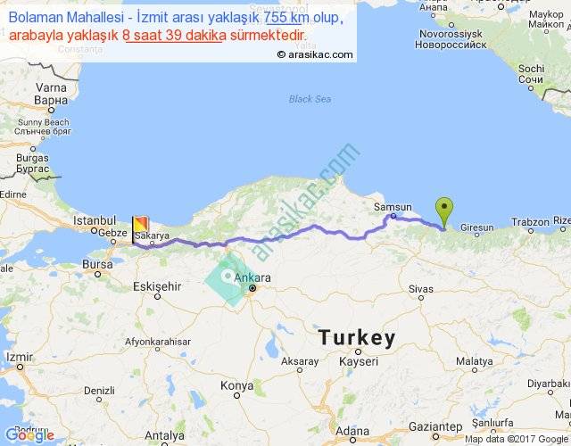 Bolaman Mahallesi - İzmit arası yaklaşık olarak 90 km/h ile yukarıda belirtilen sürede olup, iki yerin kuş uçuşu uzaklığı (mesafesi) 640'dir. Eğer belirtilen yerler arasında uçak seferi var ise bu süre uçakla 59 dakika'ya kadar düşebilir. Yolculuk otobüsle 11 saat 14 dakika sürmektedir.