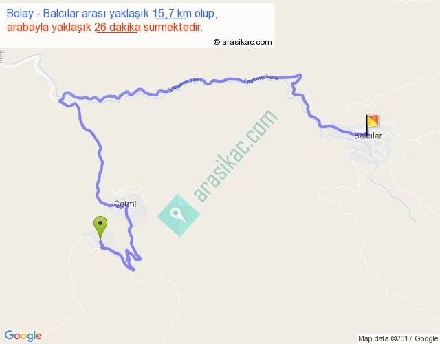 Bolay - Balcılar arası yaklaşık olarak 90 km/h ile yukarıda belirtilen sürede olup, iki yerin kuş uçuşu uzaklığı (mesafesi) 6'dir. Yolculuk otobüsle 33 dakika sürmektedir.