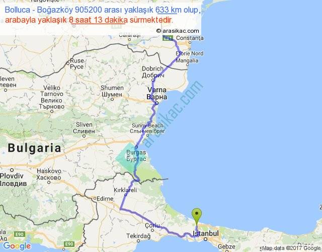 Bolluca - Boğazköy 905200 arası yaklaşık olarak 90 km/h ile yukarıda belirtilen sürede olup, iki yerin kuş uçuşu uzaklığı (mesafesi) 349'dir. Eğer belirtilen yerler arasında uçak seferi var ise bu süre uçakla 32 dakika'ya kadar düşebilir. Yolculuk otobüsle 10 saat 40 dakika sürmektedir.