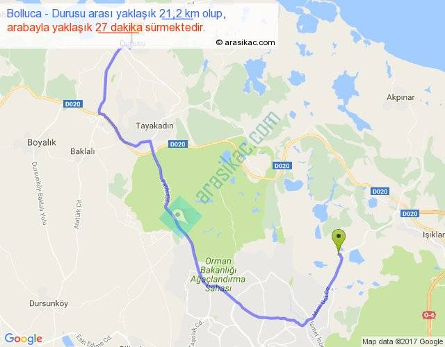 Bolluca - Durusu arası yaklaşık olarak 90 km/h ile yukarıda belirtilen sürede olup, iki yerin kuş uçuşu uzaklığı (mesafesi) 12'dir. Yolculuk otobüsle 35 dakika sürmektedir.