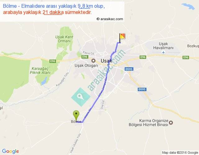 Bölme - Elmalıdere arası yaklaşık olarak 90 km/h ile yukarıda belirtilen sürede olup, iki yerin kuş uçuşu uzaklığı (mesafesi) 9'dir. Yolculuk otobüsle 27 dakika sürmektedir.