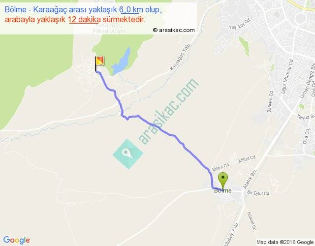 Bölme - Karaağaç arası yaklaşık olarak 90 km/h ile yukarıda belirtilen sürede olup, iki yerin kuş uçuşu uzaklığı (mesafesi) 5'dir. Yolculuk otobüsle 15 dakika sürmektedir.