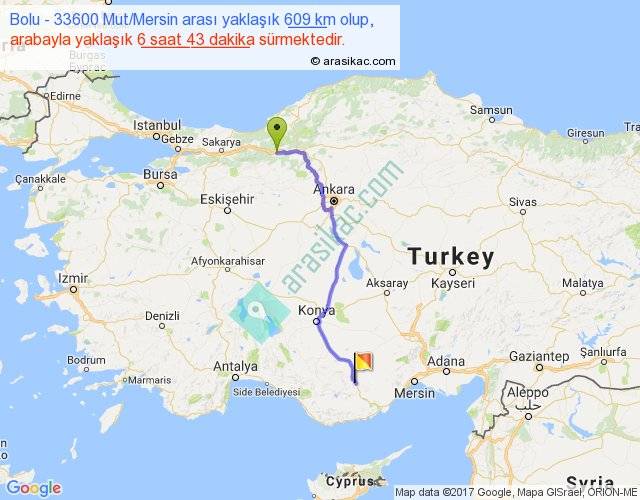 Bolu - 33600 Mut Mersin arası yaklaşık olarak 90 km/h ile yukarıda belirtilen sürede olup, iki yerin kuş uçuşu uzaklığı (mesafesi) 461'dir. Eğer belirtilen yerler arasında uçak seferi var ise bu süre uçakla 42 dakika'ya kadar düşebilir. Yolculuk otobüsle 8 saat 43 dakika sürmektedir.