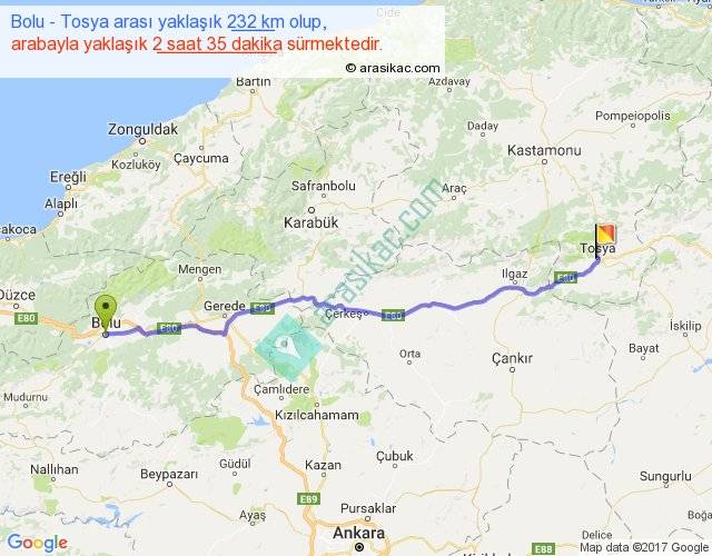 Bolu - Tosya arası yaklaşık olarak 90 km/h ile yukarıda belirtilen sürede olup, iki yerin kuş uçuşu uzaklığı (mesafesi) 205'dir. Yolculuk otobüsle 3 saat 21 dakika sürmektedir.