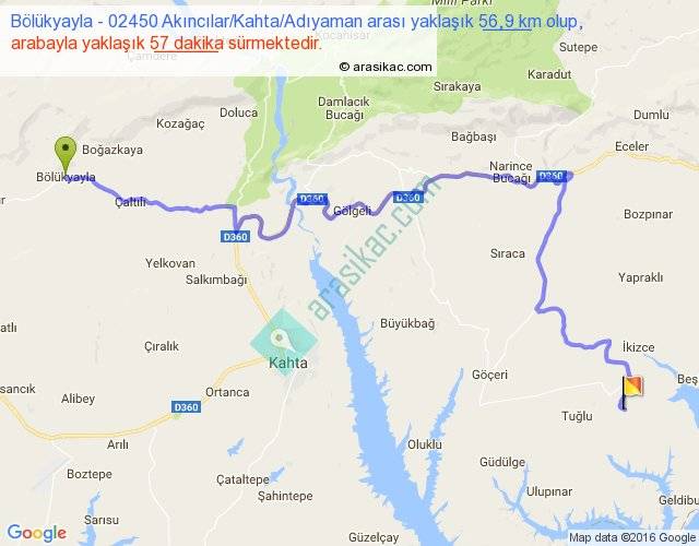 Bölükyayla - 02450 Akıncılar Kahta Adıyaman arası yaklaşık olarak 90 km/h ile yukarıda belirtilen sürede olup, iki yerin kuş uçuşu uzaklığı (mesafesi) 33'dir. Yolculuk otobüsle 1 saat 14 dakika sürmektedir.