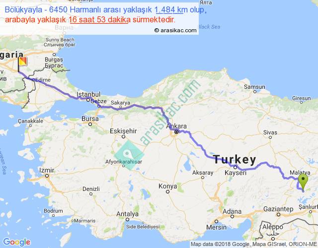 Bölükyayla - 6450 Harmanlı arası yaklaşık olarak 90 km/h ile yukarıda belirtilen sürede olup, iki yerin kuş uçuşu uzaklığı (mesafesi) 1155'dir. Eğer belirtilen yerler arasında uçak seferi var ise bu süre uçakla 1 saat 46 dakika'ya kadar düşebilir. Yolculuk otobüsle 21 saat 56 dakika sürmektedir.