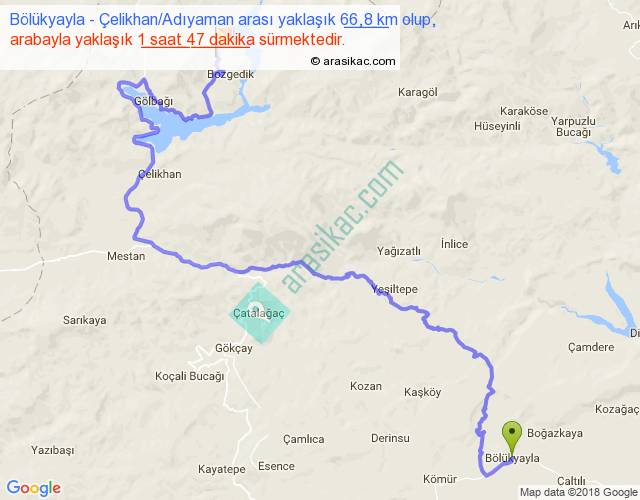 Bölükyayla - Çelikhan Adıyaman arası yaklaşık olarak 90 km/h ile yukarıda belirtilen sürede olup, iki yerin kuş uçuşu uzaklığı (mesafesi) 30'dir. Yolculuk otobüsle 2 saat 19 dakika sürmektedir.