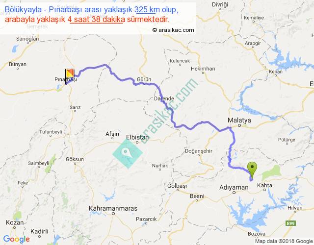 Bölükyayla - Pınarbaşı arası yaklaşık olarak 90 km/h ile yukarıda belirtilen sürede olup, iki yerin kuş uçuşu uzaklığı (mesafesi) 203'dir. Yolculuk otobüsle 6 saat 1 dakika sürmektedir.