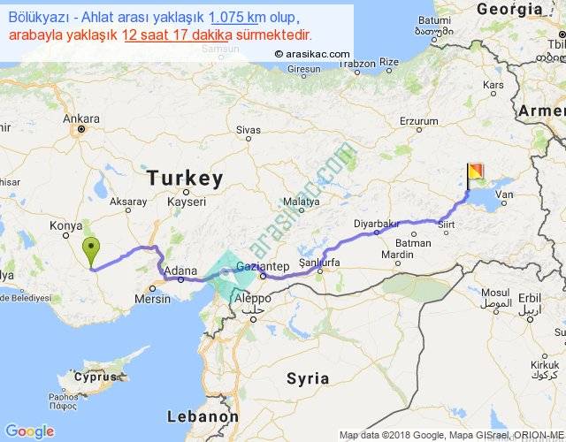 Bölükyazı - Ahlat arası yaklaşık olarak 90 km/h ile yukarıda belirtilen sürede olup, iki yerin kuş uçuşu uzaklığı (mesafesi) 834'dir. Eğer belirtilen yerler arasında uçak seferi var ise bu süre uçakla 1 saat 16 dakika'ya kadar düşebilir. Yolculuk otobüsle 15 saat 58 dakika sürmektedir.