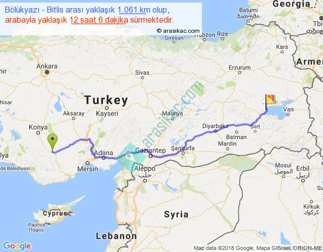 Bölükyazı - Bitlis arası yaklaşık olarak 90 km/h ile yukarıda belirtilen sürede olup, iki yerin kuş uçuşu uzaklığı (mesafesi) 828'dir. Eğer belirtilen yerler arasında uçak seferi var ise bu süre uçakla 1 saat 16 dakika'ya kadar düşebilir. Yolculuk otobüsle 15 saat 43 dakika sürmektedir.