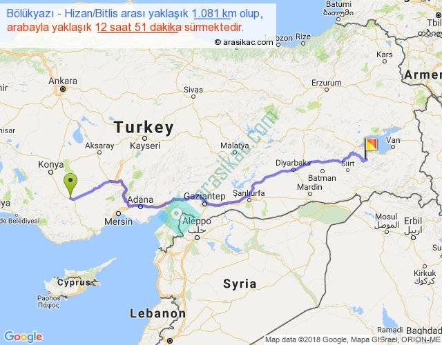 Bölükyazı - Hizan Bitlis arası yaklaşık olarak 90 km/h ile yukarıda belirtilen sürede olup, iki yerin kuş uçuşu uzaklığı (mesafesi) 830'dir. Eğer belirtilen yerler arasında uçak seferi var ise bu süre uçakla 1 saat 16 dakika'ya kadar düşebilir. Yolculuk otobüsle 16 saat 42 dakika sürmektedir.