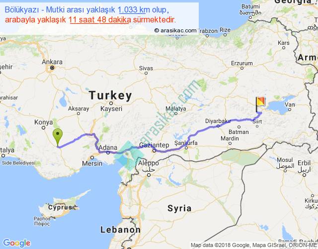 Bölükyazı - Mutki arası yaklaşık olarak 90 km/h ile yukarıda belirtilen sürede olup, iki yerin kuş uçuşu uzaklığı (mesafesi) 781'dir. Eğer belirtilen yerler arasında uçak seferi var ise bu süre uçakla 1 saat 12 dakika'ya kadar düşebilir. Yolculuk otobüsle 15 saat 20 dakika sürmektedir.