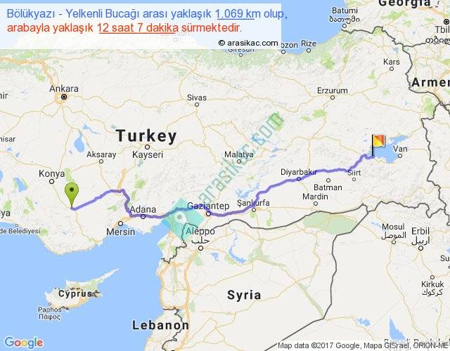 Bölükyazı - Yelkenli Bucağı arası yaklaşık olarak 90 km/h ile yukarıda belirtilen sürede olup, iki yerin kuş uçuşu uzaklığı (mesafesi) 835'dir. Eğer belirtilen yerler arasında uçak seferi var ise bu süre uçakla 1 saat 17 dakika'ya kadar düşebilir. Yolculuk otobüsle 15 saat 45 dakika sürmektedir.