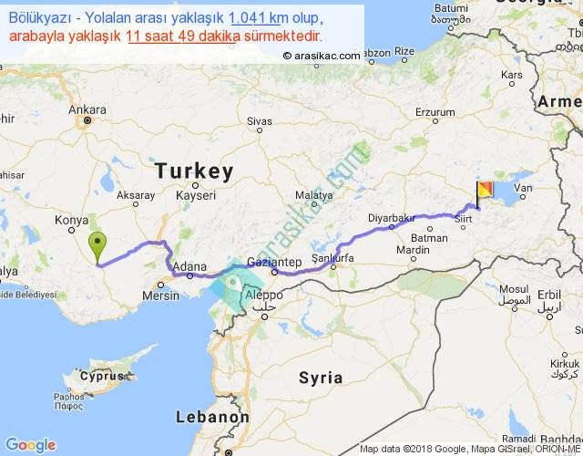 Bölükyazı - Yolalan arası yaklaşık olarak 90 km/h ile yukarıda belirtilen sürede olup, iki yerin kuş uçuşu uzaklığı (mesafesi) 812'dir. Eğer belirtilen yerler arasında uçak seferi var ise bu süre uçakla 1 saat 14 dakika'ya kadar düşebilir. Yolculuk otobüsle 15 saat 21 dakika sürmektedir.