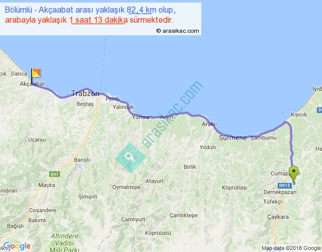 Bölümlü - Akçaabat arası yaklaşık olarak 90 km/h ile yukarıda belirtilen sürede olup, iki yerin kuş uçuşu uzaklığı (mesafesi) 64'dir. Yolculuk otobüsle 1 saat 34 dakika sürmektedir.