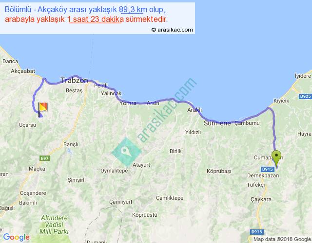 Bölümlü - Akçaköy arası yaklaşık olarak 90 km/h ile yukarıda belirtilen sürede olup, iki yerin kuş uçuşu uzaklığı (mesafesi) 57'dir. Yolculuk otobüsle 1 saat 47 dakika sürmektedir.