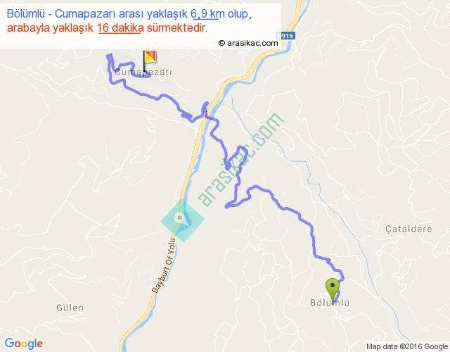 Bölümlü - Cumapazarı arası yaklaşık olarak 90 km/h ile yukarıda belirtilen sürede olup, iki yerin kuş uçuşu uzaklığı (mesafesi) 3'dir. Yolculuk otobüsle 20 dakika sürmektedir.