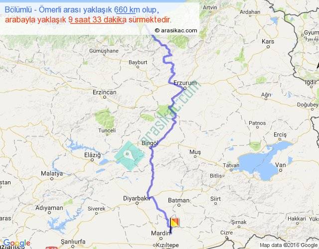 Bölümlü - Ömerli arası yaklaşık olarak 90 km/h ile yukarıda belirtilen sürede olup, iki yerin kuş uçuşu uzaklığı (mesafesi) 382'dir. Eğer belirtilen yerler arasında uçak seferi var ise bu süre uçakla 35 dakika'ya kadar düşebilir. Yolculuk otobüsle 12 saat 24 dakika sürmektedir.
