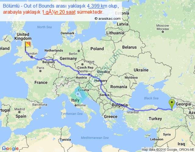 Bölümlü - Out of Bounds arası yaklaşık olarak 90 km/h ile yukarıda belirtilen sürede olup, iki yerin kuş uçuşu uzaklığı (mesafesi) 3396'dir. Eğer belirtilen yerler arasında uçak seferi var ise bu süre uçakla 5 saat 13 dakika'ya kadar düşebilir. Yolculuk otobüsle 2 gün 9 saat sürmektedir.