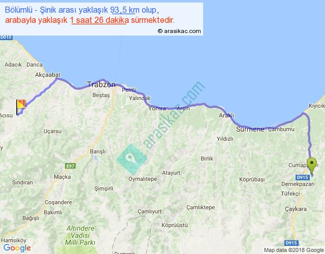 Bölümlü - Şinik arası yaklaşık olarak 90 km/h ile yukarıda belirtilen sürede olup, iki yerin kuş uçuşu uzaklığı (mesafesi) 68'dir. Yolculuk otobüsle 1 saat 51 dakika sürmektedir.