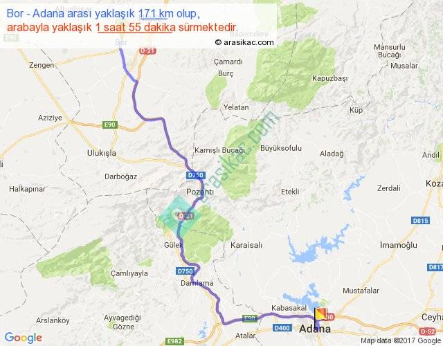 Bor - Adana arası yaklaşık olarak 90 km/h ile yukarıda belirtilen sürede olup, iki yerin kuş uçuşu uzaklığı (mesafesi) 120'dir. Yolculuk otobüsle 2 saat 29 dakika sürmektedir.