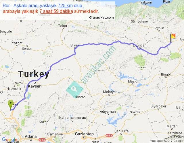 Bor - Aşkale arası yaklaşık olarak 90 km/h ile yukarıda belirtilen sürede olup, iki yerin kuş uçuşu uzaklığı (mesafesi) 573'dir. Eğer belirtilen yerler arasında uçak seferi var ise bu süre uçakla 52 dakika'ya kadar düşebilir. Yolculuk otobüsle 10 saat 22 dakika sürmektedir.