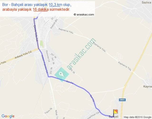 Bor - Bahçeli arası yaklaşık olarak 90 km/h ile yukarıda belirtilen sürede olup, iki yerin kuş uçuşu uzaklığı (mesafesi) 8'dir. Yolculuk otobüsle 20 dakika sürmektedir.