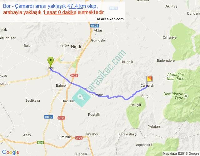 Bor - Çamardı arası yaklaşık olarak 90 km/h ile yukarıda belirtilen sürede olup, iki yerin kuş uçuşu uzaklığı (mesafesi) 38'dir. Yolculuk otobüsle 1 saat 18 dakika sürmektedir.