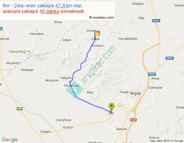 Bor - Çarşı arası yaklaşık olarak 90 km/h ile yukarıda belirtilen sürede olup, iki yerin kuş uçuşu uzaklığı (mesafesi) 32'dir. Yolculuk otobüsle 52 dakika sürmektedir.