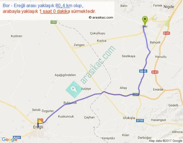 Bor - Ereğli arası yaklaşık olarak 90 km/h ile yukarıda belirtilen sürede olup, iki yerin kuş uçuşu uzaklığı (mesafesi) 62'dir. Yolculuk otobüsle 1 saat 18 dakika sürmektedir.