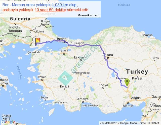 Bor - Mercan arası yaklaşık olarak 90 km/h ile yukarıda belirtilen sürede olup, iki yerin kuş uçuşu uzaklığı (mesafesi) 750'dir. Eğer belirtilen yerler arasında uçak seferi var ise bu süre uçakla 1 saat 09 dakika'ya kadar düşebilir. Yolculuk otobüsle 14 saat 5 dakika sürmektedir.
