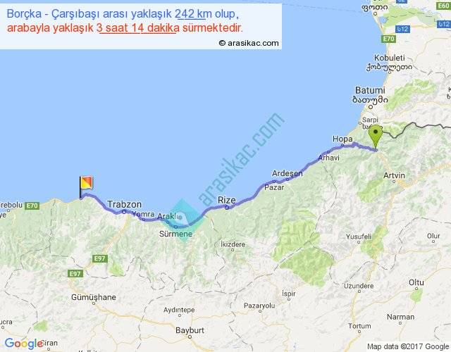 Borçka - Çarşıbaşı arası yaklaşık olarak 90 km/h ile yukarıda belirtilen sürede olup, iki yerin kuş uçuşu uzaklığı (mesafesi) 194'dir. Yolculuk otobüsle 4 saat 12 dakika sürmektedir.